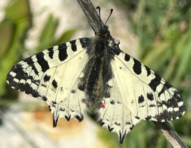 Day 4, Saturday, started with a drive towards the Troodos mountains which rise to 2000m, so there was a change of scenery as we headed up the Diarizos valley. Our first stop was at an orchid-rich meadow where we saw Himantoglossum robertianum, Orchis italica, Ophrys sicula, and others. We saw two new butterfly species, the Eastern Festoon and Orange tip. We then continued on our way, stopping at the mountain wine village of Omodos, with characteristic architecture, interesting craft shops, a most impressive wine press and a beautiful church with fine chandeliers. We had our picnic on park benches above the village. and then we drove up towards Mount Olympus through a village which had been a fashionable resort in the 19th century.