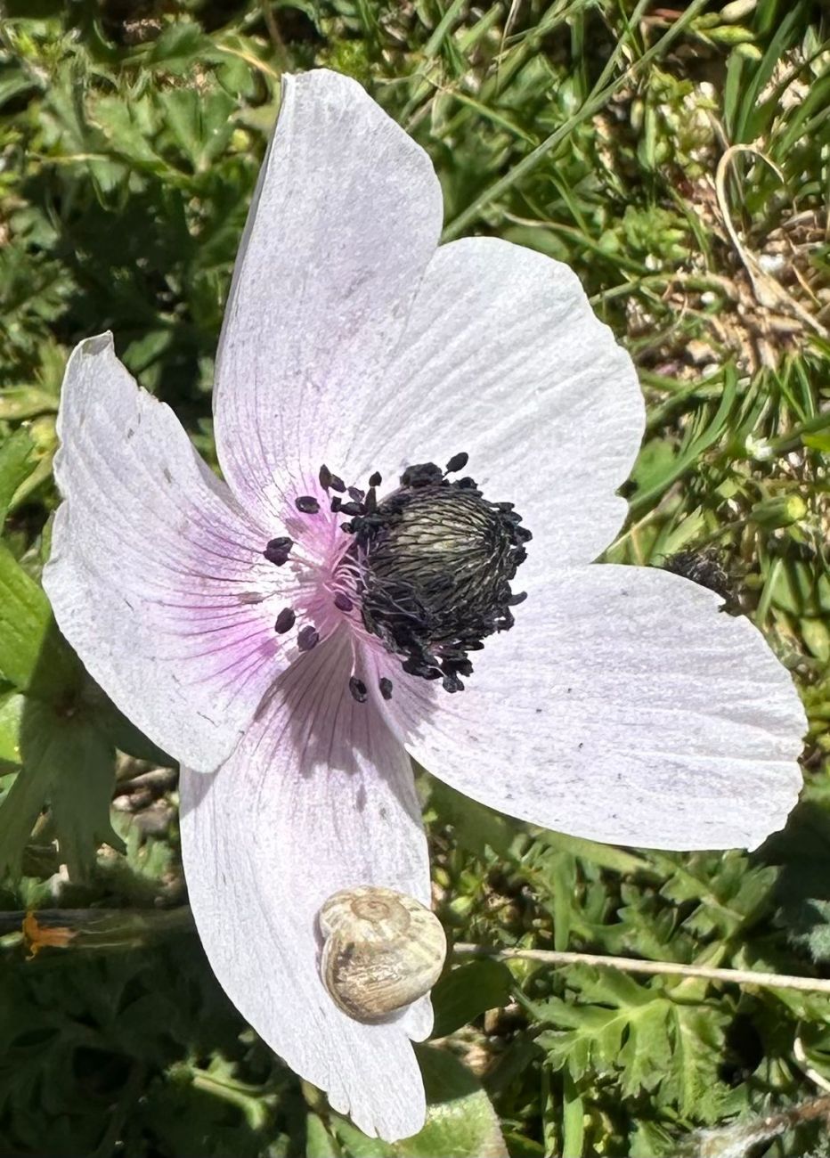 At the top of the Troodos mountains, most of the winter snow had already melted but we did manage to find a few Crocus cyprius in flower after donning our “winter woollies”. It was snowing a bit at the time when we were close by the fence of the British radar station at the top of the mountain. We then started on the return journey, seeing a large area of multicoloured anemones and having an unexpected delight when we stopped in the centre of a stone village called Anogyra, and Yiannis showed us his own garden – with some rare and endangered species. It was spectacularly beautiful too with plenty of flowers and a lovely trumpet flowered creeper along the house.