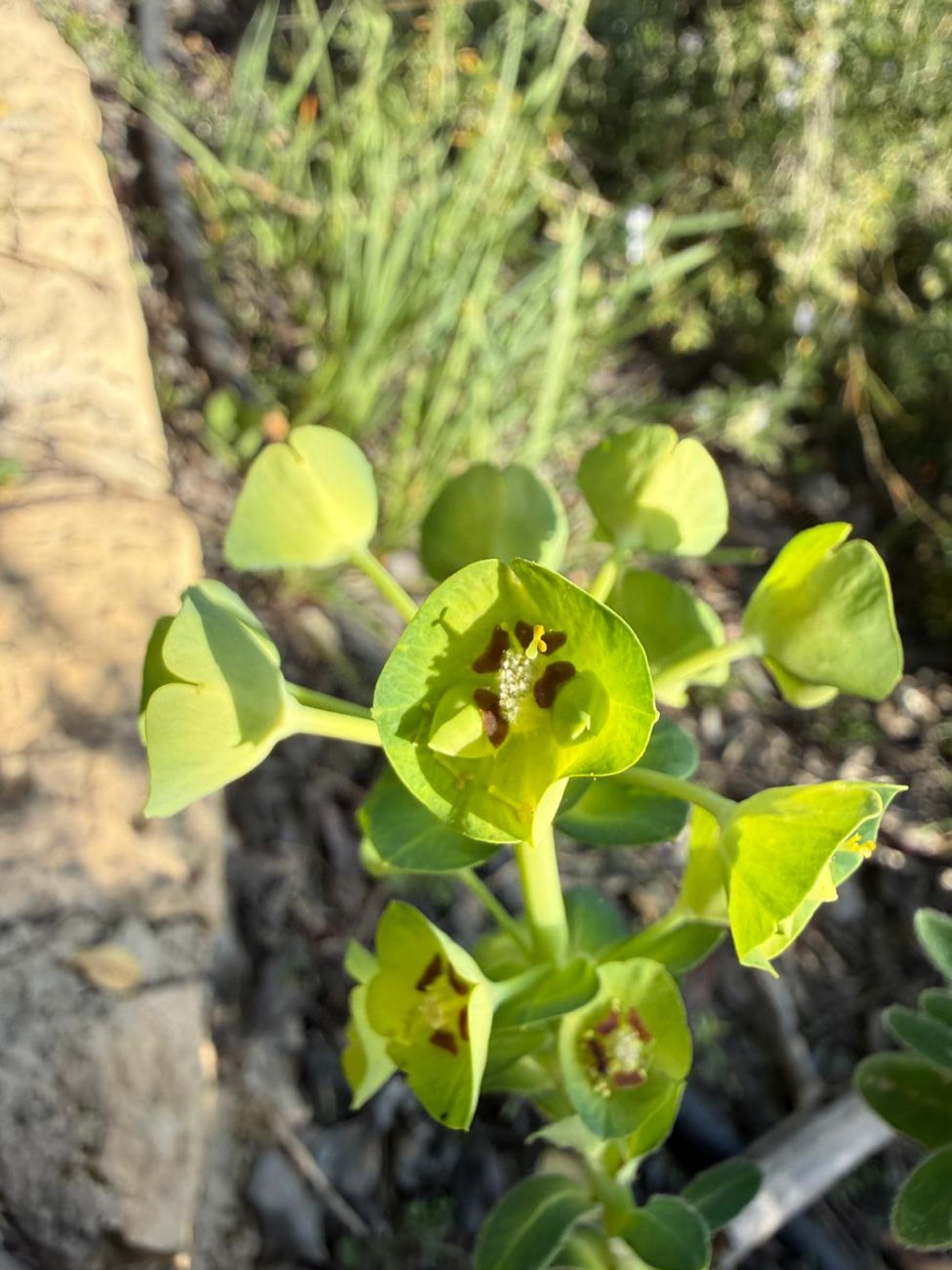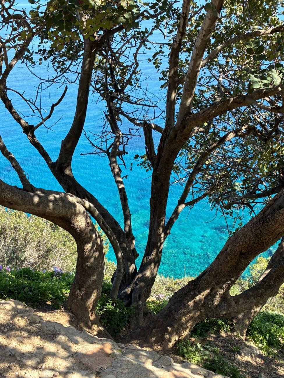 On Day 6, on Monday, we went walking in the fields above the hotel. We saw an orchard of carob trees and learnt about them and their uses. In a valley, there were many interesting plants amongst Genista, including many orchids, Cyclamen persicum, Bellevalia trifoliata, Lotus purpureus and others. Highlight of the day was the impressive yellow Orchis punctulata, found in Cyprus, southern Turkey and the Levant. We also looked into the modern, but not well kept chapel. We walked back up the hill to our picnic spot in a conservation area and returned via an area of rock pools with interesting plants such as Ranunculus peltatus. We continued down to the shore where we saw Frankenia hirsuta and Anthemis rigida.