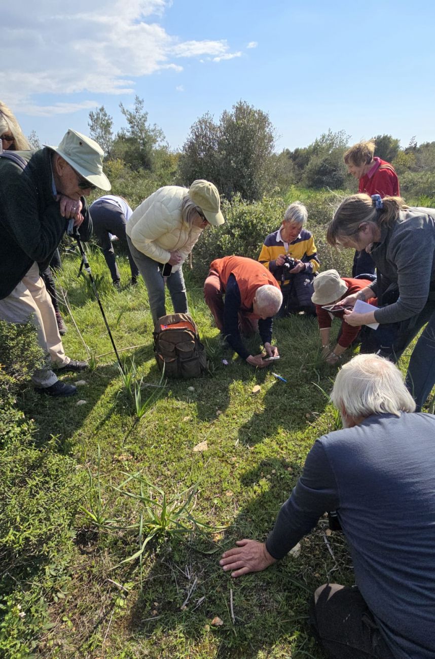 At the Tombs of the Kings, there was quite a strong cold breeze as we stood learning about the typical plants of the garigue. The Cyclamen persicum growing out of rock crevices were particularly noticeable. The impressive tombs are between the road and the sea, with various plant habitats. We saw the endemic Helianthemum obtusifolium, plus Thymus capitatus, Fumana thymifolia, Ornithogalum pedicellare, Moraea sisyrinchium, Mandragora officianalis and orchids with nice examples of Ophrys flavomarginata. The beach area provides example of sand dune habitat with the prostrate Paronychia argentea and bright Senecio glaucus cyprius.